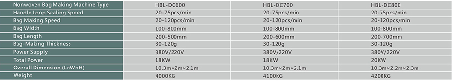 This machine is suitable for non woven fabric material only, it is the most advanced equipment and has the functionof full. automatic handle loop sealing. The speed is about 20-75 pcs/min, it equals to 5 workers operating 5 handlesealing machines, It can ully automatic make non woven bag products with diferent bag type and size, as handleattached bags, T-shirt bags (vest bags), box bags, flat bags, drawstring bags and so on, It has widely used in clothing,footwear, wine, gifts packaging etc. The machine can instead of the traditional hand-sewing and reducing labor andmanufacturing costs. It's very popular in worldwide.